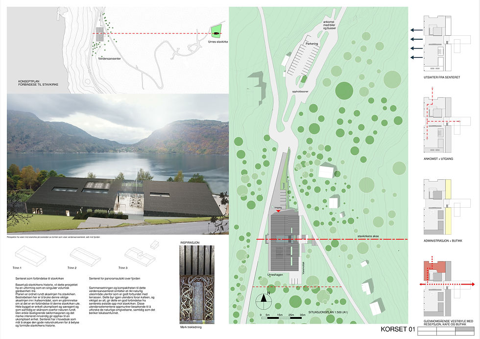 The Urnes World Heritage Center strives to be the embodiment of the history and identity of the Urnes Stave Church. The overall goal is to let the design strengthen the center's function through architectural design, especially with the help of the roof which connects strongly to the landscape and the "Urneshagen".
